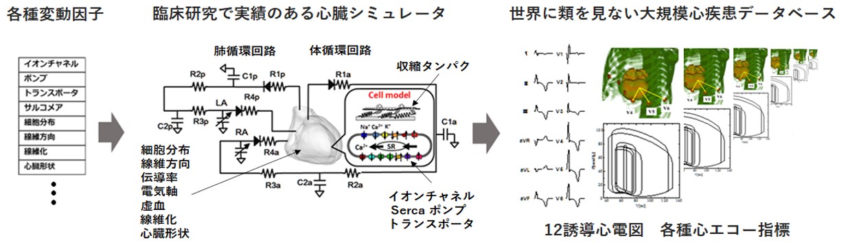 富岳のパワーと臨床研究で実績のあるUT-Heartを活用し、健康で標準的な心臓モデルをベースに、心不全に関与する可能性のあるミクロからマクロまでの諸因子を変動させた多数の心臓モデル群を作成し、その総てについて電気的興奮伝播シミュレーションと力学的拍動シミュレーションを実施します。さらに、それらの結果から12誘導心電図と各種心エコー指標を求め、大規模な心疾患データベースとして公開します。本データベースは基礎医学、臨床医学から個人の健康診断まで、従来の概念を超えた新次元の応用を可能とします。